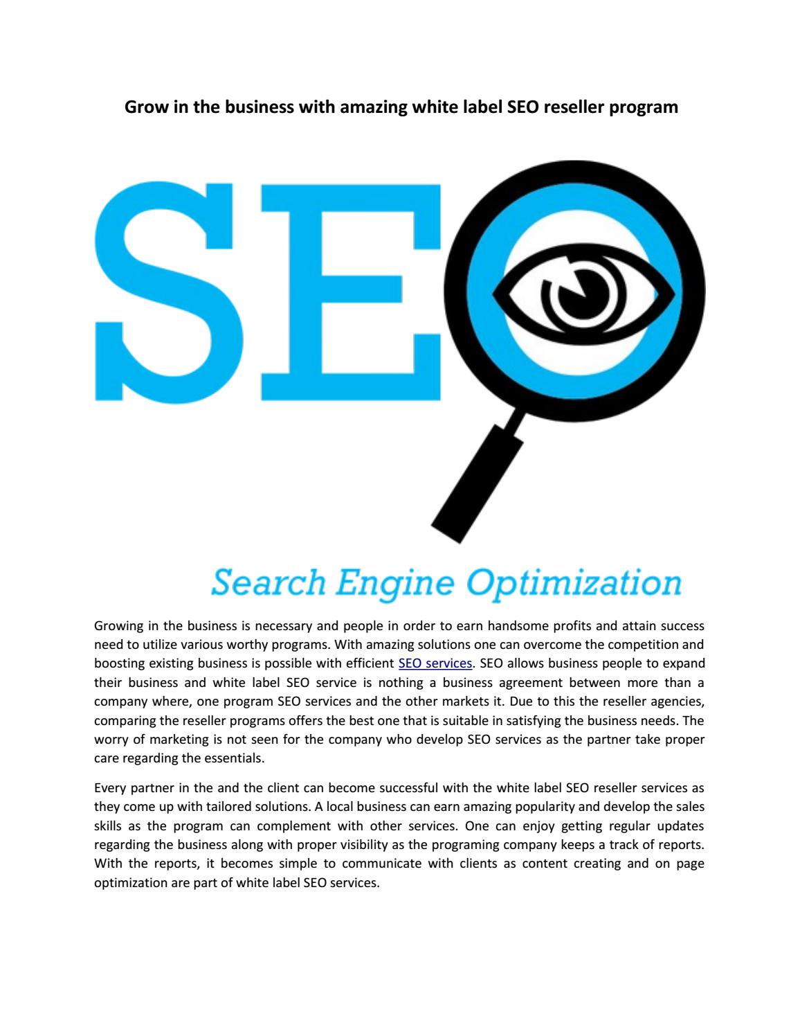 Free White Label Reseller Programs - Hop In Top Online white label reseller programs include the following: Search engine optimization (SEO) Pay per click (PPC) Social media marketing (SMM) Facebook services Instagram services Design Branding Inbound Marketing Digital Marketing Reputation Management Mail Becoming a white label reseller provides many benefits.