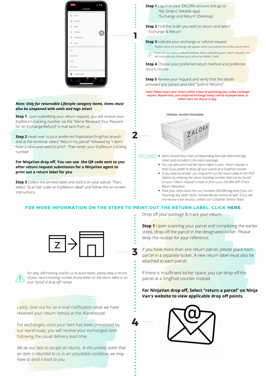 Easy Returns | Under Armour If you have multiple orders to return, each order must be return separately. 1. Log into your account here to view Order History or track your order here as guest. 2. Check items to return. 3. Print label and packing slip. 4. Place packing slip in return package. 5. Attach label to the package. 6. Send it back to us. AUSPOST Locations