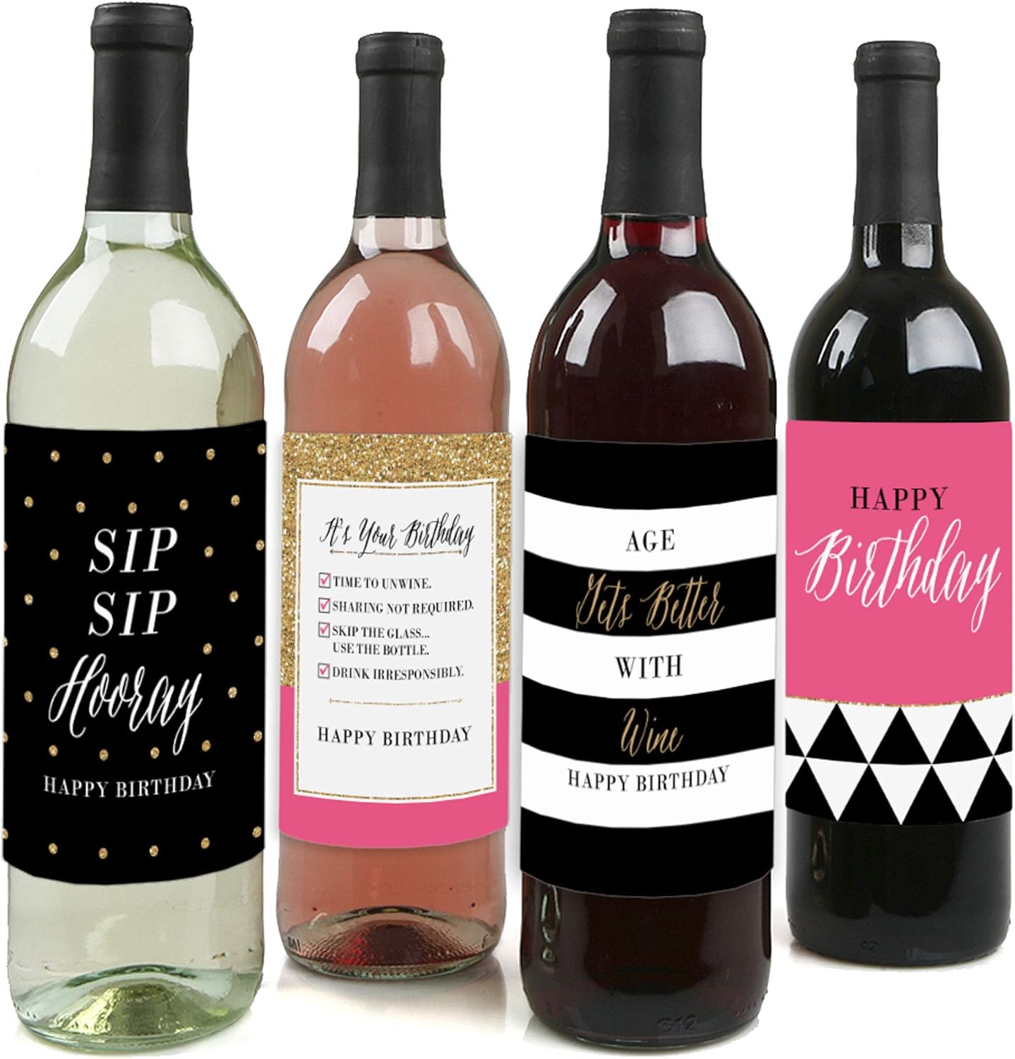 Chic Happy Birthday - Pink, Black and Gold - Birthday Gift For Women - Wine Bottle Label Stickers - Set of 4
