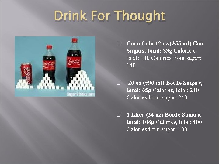 Carbs in 20 oz coke. Pepsi 12 Oz - 16 oz pepsi in a bottle had to take the empties back to ... Pepsi 12 Oz - 18 images - brand eating march 2013, the facts about your favorite beverages u s product, pepsi made with real sugar vanilla soft drinks beverages pepsico, pepsi cola ideal 55 antique refinishing services, coca zero sucre Coca-Cola Zero sucre Coca-Cola Zero sugar Net Wt 355ml. Laspartame et lacésulfame de potassium. You dont need to worry about how many grams of sugar Coke has. Coca-Cola à votre écoute au 09 69 39 29 00 appel non surtaxé Informations légales. Coca Cola Zero Sucre 1 5li Chez Champion. How Big Is Ounce? - Cooking Tom A 12-ounce (360 gram) can of coke has about 41 grams of sugar and about 91 calories. A 15-ounce (420 gram) jar of jelly has about 45 grams of sugar and about 195 calories. A 15-ounce (420 gram) jar of jelly has about 33 grams of sugar and about 150 calories. An 8-ounce (240 gram) box of crackers has about 13 grams of fat and about 140 calories ... Stock Market | Daily Herald One 20 ounce of Vitamin Water contains about 120 calories and 32 grams of sugar. Vitamin Water also contains crystalline fructose which is even worse for your health. Crystalline fructose is also...
