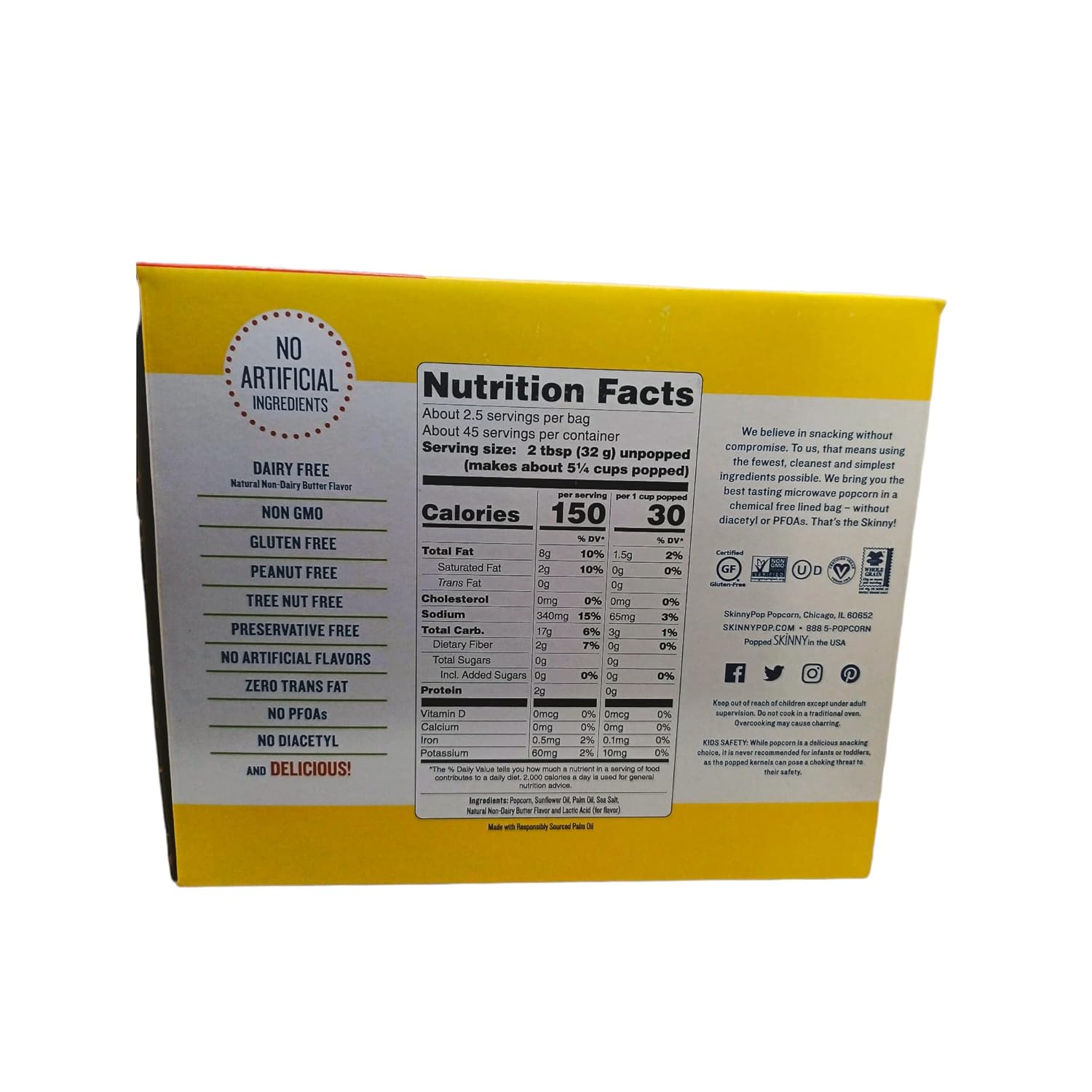 Amazon.com: SkinnyPop Popcorn, Gluten Free, Dairy Free, Non-GMO ... SkinnyPop Original popcorn contains 6 (0.65 oz) bags. Great for a kids lunch snack Delicious Skinny Pop Popcorn has zero trans fat and is peanut free, tree nut free, preservative free and is a good source of fiber A delicious, healthy snack perfect for kids lunches, break between video calls, or just a snack for yourself. skinny pop nutrition — Food Labels — Madison Mae Instead of Skinny Pop, try Lesser Evil Organic Popcorn. They make the most delicious popcorn and only use quality oils like ghee, avocado oil, and coconut oil. They also use organic popcorn. Try my personal favorite- the Himalayan Pink Sea Salt! Much better. Organic, non-gmo popcorn and a healthy oil! Read more about the omega-6 to omega-3 ... Calories in Skinny Pop Popcorn and Nutrition Facts - FatSecret There are 39 calories in 1 cup (8 g) of Skinny Pop Popcorn. Calorie breakdown: 55% fat, 37% carbs, 8% protein. Related Popcorn from Skinny Pop: Popcorn Mini Cakes Salted Caramel: Pepper Jack Popcorn: Kettle Corn Sweet Vanilla: Sweet Cinnamon Popcorn Puffs: Real Butter Popcorn: White Cheddar Popped Popcorn Popcorn - SkinnyPop Guilt-free snacking with a dairy-free white cheddar flavor. NO ARTIFICIAL INGREDIENTS NON GMO GLUTEN FREE DAIRY FREE PEANUT FREE TREE NUT FREE PRESERVATIVE FREE NO ARTIFICIAL FLAVORS ZERO TRANS FAT AND DELICIOUS! Ingredients: Popcorn, sunflower oil, natural non-dairy cheddar flavor, salt, rice flour, natural flavor and lactic acid. ★★★★★ ★★★★★ 3.8