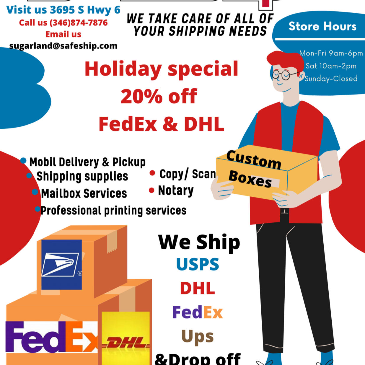 Shipping locations near you | FedEx Sugar Land Sugar Land Copy & print services Take advantage of self-service copying and full-service printing services at FedEx Office in Sugar Land. Learn about our latest offers and special deals at FedEx Office. Or start your order online for pickup within 24 hours. VIEW COPY & PRINTING SERVICES Boxes & packaging