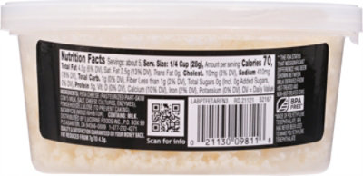 Feta Cheese Nutrition Label - Dining Services Vitamin D - IU. Vitamin C 0%. Cholesterol. Calcium 2%. Iron 0%. Potassium. INGREDIENTS: CRUMBLE FETA CHEESE (Pasteurized Milk, Salt, Cheese Culture, Enzymes) ALLERGENS: Milk. Note: Nutritional Values that are not available for a recipe are represented by dashes.