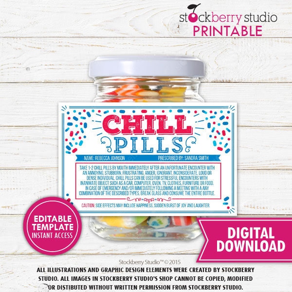 Pin on Inspirations Funny and Clever this Jar of Emergency Chill Pills printable label is the perfect gag gift for so many occasions!!! This chills pills printable label is a perfect funny and gag gift for a Professional Office Gift, teacher gift, Christmas Gift, Birthday Gift, Boss Gift or Coworker Gift Need a smaller version? The Chronicles of Unsinkable Sallie I'm thankful my doctor stepped in and said the right thing: "You need to take some time to take care of yourself." I just wish she hadn't said it right before the Christmas season. But I'm learning from my young teammates and fellow bloggers. They would tell me to take a chill pill, and that's exactly what I'm going to do. EDITABLE Chill Pills Label, Funny Gag Gift Professional Office Gift ... DIRECTIONS FOR APPLYING LABELS: 1. Print out Labels and Cut them out ( Print on either Regular Paper or Sticker Paper ) 2. Soak Bottle or jar to Easily Remove Original Labels. 3. Let jar dry completely! 4. Once the jar is completly dry attach label. If using sticker paper, simply peel and stick on the bottles. If using regular