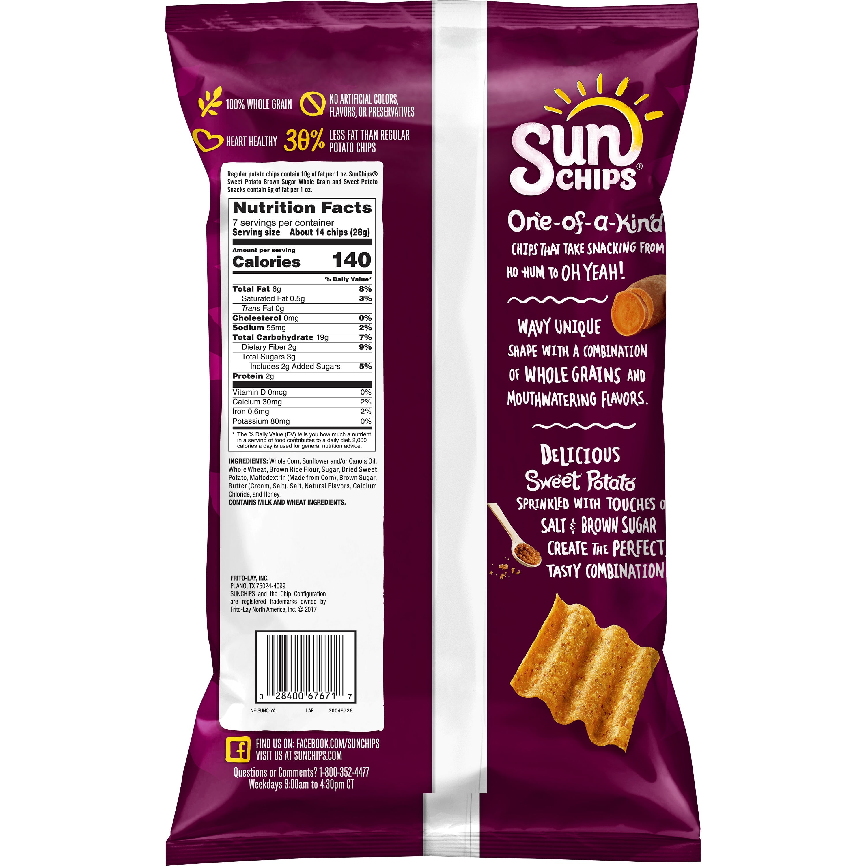 QUICK REVIEW: SunChips Sweet Potato & Brown Sugar Mar 22, 2018 ... Nutrition Facts: (about 14 chips) 140 calories, 6 grams of fat, 0.5 grams of saturated fat, 0 grams of trans fat, 0 milligrams of cholesterol, ...