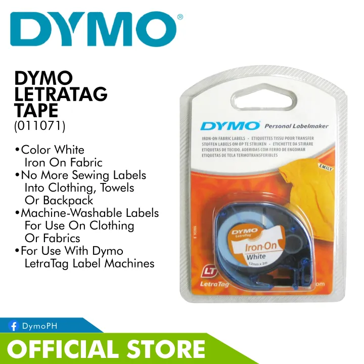 DYMO LetraTag Iron-on Tape 12mm Black on White - Officeworks DYMO LetraTag Iron-on Tape is a great option for labelling fabric, clothes, manchester and more. Simply print the label and then iron it onto the fabric making it easy for you to identify your items. This tape is perfect for use on clothing and fabrics. The tape measures 12 mm x 2 m. It's compatible with the DYMO LetraTag label maker