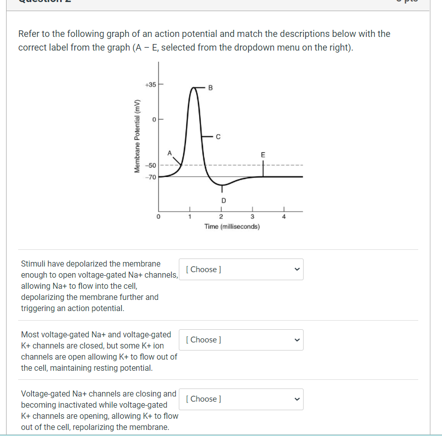 Anatomy Midterm Lecture Flashcards | Quizlet The following information best describes the _____________ phase of an action potential. • A membrane potential reading of +10 mV • Inactivated voltage-gated sodium channels • Open voltage-gated potassium channels Repolarization Label each phase of the action potential as identified by the highlighted region of each graph.