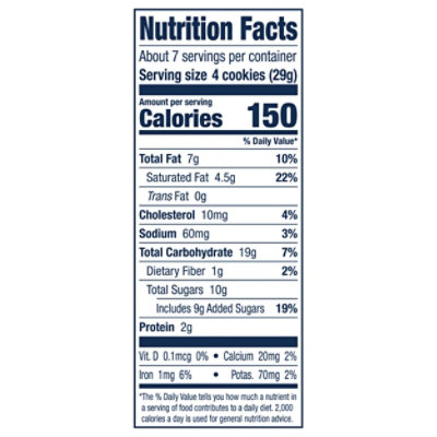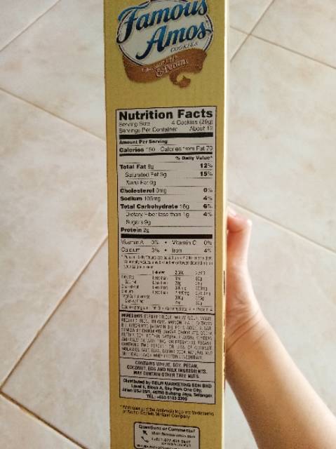 Famous Amos Cookies Nutrition Label - FAMOSAN Famous Amos Chocolate Chip Cookies Nutrition Facts Serving Size Cookies 4 Cookies = 29G Amount Per Serving 140 Calories % Daily Value* 11% Total Fat 7G 13% Saturated Fat 2.5G Trans Fat 0G 0% Cholesterol 0Mg 5% Sodium 105Mg 7% Total Carbohydrate 20G 4% Dietary Fiber 1G Total Sugars 9G 18% Includes 9G Added Sugars Protein 1G 0% Vitamin D 0Mcg