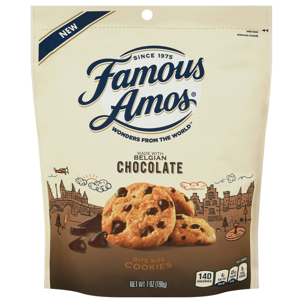 Our Cookies | Famous Amos We traveled the most renowned places in the world to discover the highest quality ingredients and bake them into the Famous Amos Wonders from the World™. . Now you can savor the world in a crunchy, bite-size cookie that comes in four unique flavors - Belgian Chocolate Chip, Philippine Coconut and White Chocolate Chip, Mediterranean Hazelnut and Chocolate Chip, and British Salted Caramel and ...