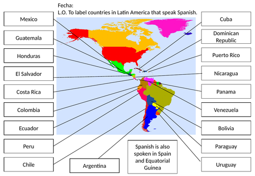 Map Labeling Spanish Speaking Contries Teaching Resources | TPT Spanish-Speaking Countries Map for Labeling by Senorita Hinbern 5.0 (34) $2.00 PDF This is a worksheet with a map of Central America, South America, Europe, and Africa. It has students label all 21 Spanish-speaking countries, indicated by arrows pointing to each country.