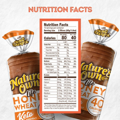 Nature's Own Life Keto Friendly Honey Wheat Bread 40 Calories 80 calories; 0 g sat fat (0% DV); 140 mg sodium (6% DV); 2 g total sugars. 40 calories per slice. 0 g of trans fat per serving. 10 g carbs - 3 g fiber = 7 net ...