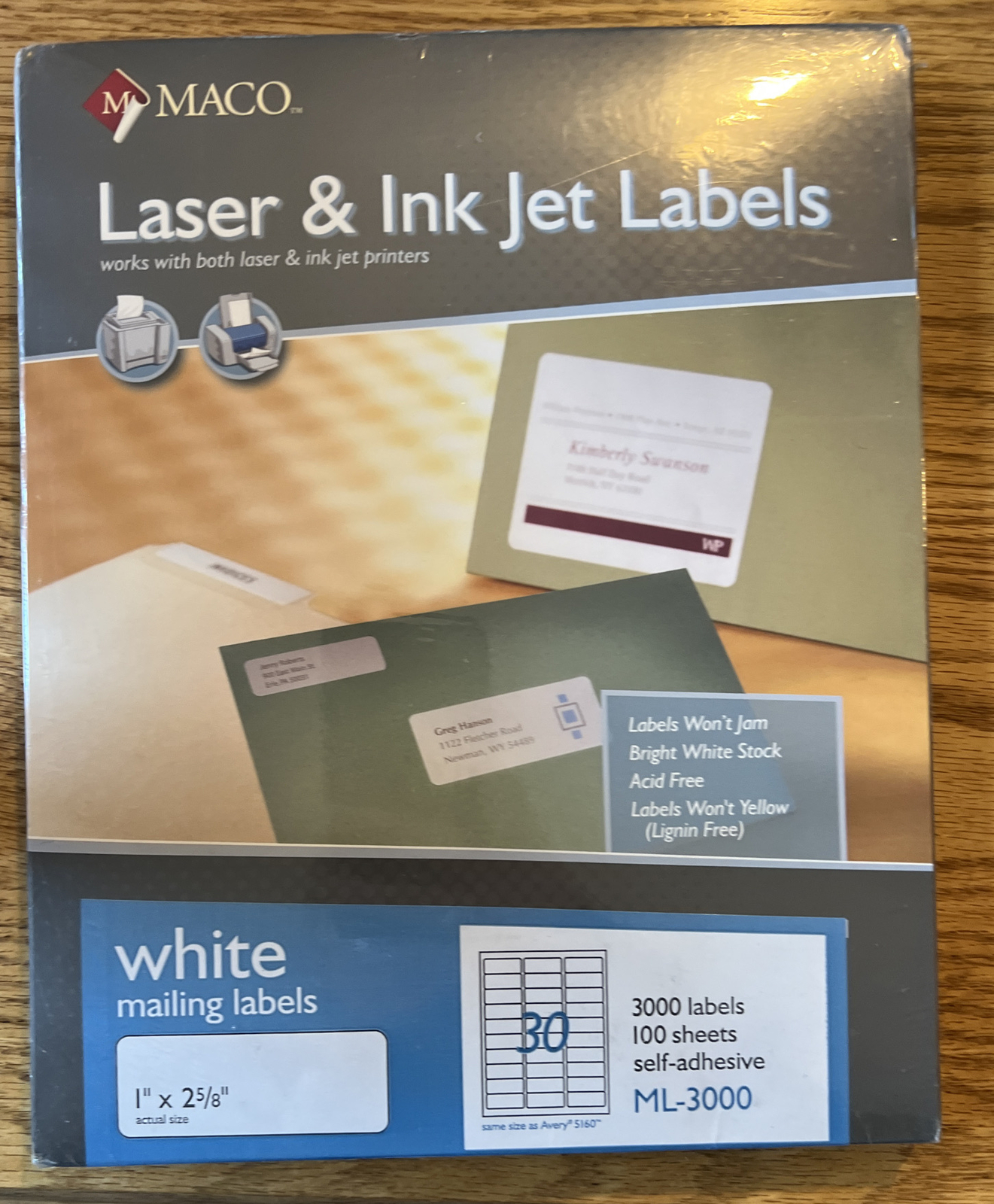 Maco ml-3000. MACO ML-3000 Laser Inkjet Labels 2.625" x 1" Laser ... MACO ML 3000 Laser Inkjet Labels Free Shipping on 5+ Packs ! Label Size: 2.625″ x 1″ Labels Per Sheet: 30 Features & Benefits of MACO Laser Labels Bright white facestock Acid and lignin free to prevent yellowing. Lay flat liner eliminates jams due to curling. Liner is watermarked so you install the labels correctly every time! Permanent Adhesive Amazon.com : MACO Laser/Ink Jet White Address Labels, 1 x 2-5 ... Feb 15, 2012 · MACO Laser/Ink Jet White Address Labels, 1 x 2-5/8 Inches, 30 Per Sheet, 3000 Per Box (ML-3000) (5 Boxes) Visit the Maco Store 5 ratings $6997 Similar item to consider Anylabel 1" x 2-5/8" Shipping Address Labels for Laser & Inkjet Printer - 30 Per Page Mailing Labels for Packages Adhesive (100 Sheets, 3000 Labels) (171) $12.99 ($0.00/Count) + + ML-3000 Single Box -- 30 Labels per Sheet -- 2-5/8 These labels feature: 100 sheets and 3000 labels per box. 2-5/8" X 1" Labels, 30 per Sheet, Permanent White. Sold here in single box quantity. Also known as MML-3000, MML3000, or ML3000