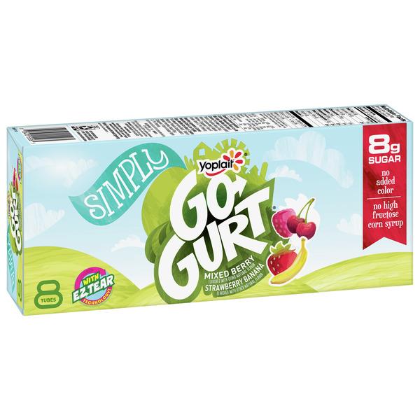 › products › simply-strawberryStrawberry | Yoplait Simply GO-GURT® | Yoplait US Contains 1% or less of: Kosher Gelatin, Tricalcium Phosphate, Natural Flavor, Potassium Sorbate Added to Maintain Freshness, Vitamin A Acetate, Vitamin D3. CONTAINS MILK INGREDIENTS. Nutrition Facts Serving size: 3 tubes (170g) Amount per serving Calories 140 As Packaged Ingredients, nutrition facts, and allergen statements can change.